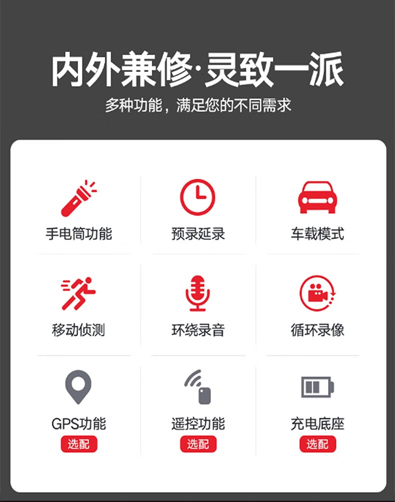 v 超強(qiáng)紅外,2顆大功率紅外燈開啟可攝像和拍照,10米內(nèi)能看清人臉,15米內(nèi)能看清人體輪廓;