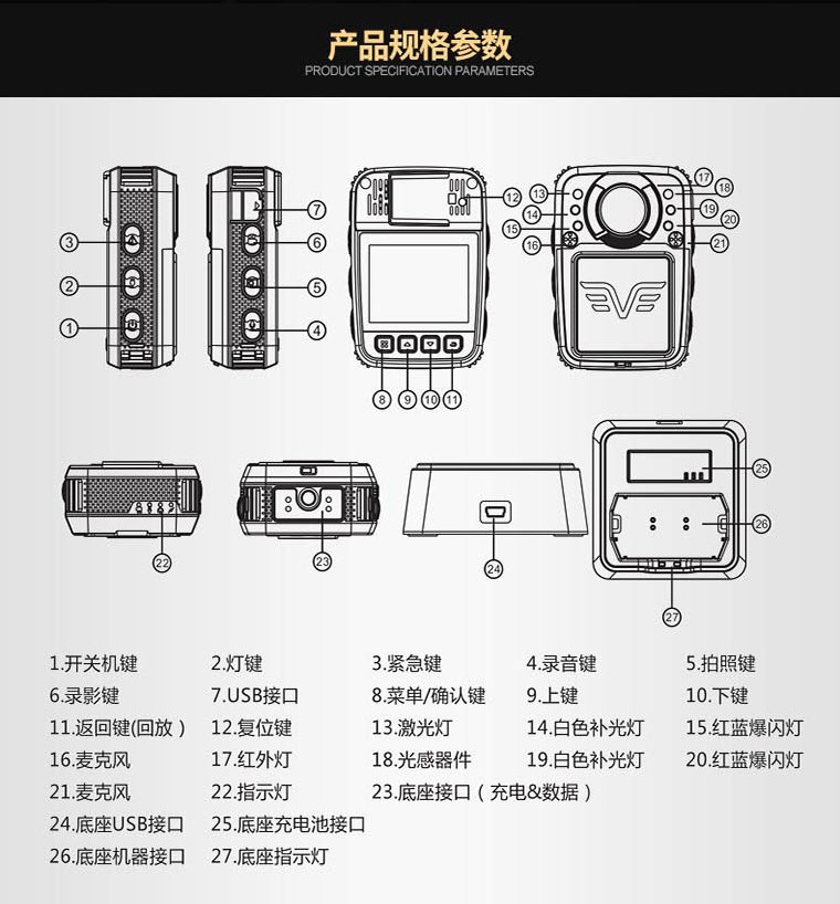 v 配備肩夾,胸口皮套,可選汽車吸盤,三腳架,對講機(jī)連接線,外借攝像頭;