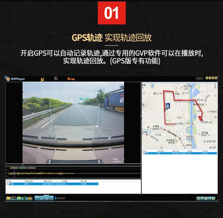 v GPS軌跡,開啟GPS可以自動(dòng)記錄軌跡,通過專用的GVP軟件可以在播放時(shí),實(shí)現(xiàn)軌跡回放。(GPS版專有功能);